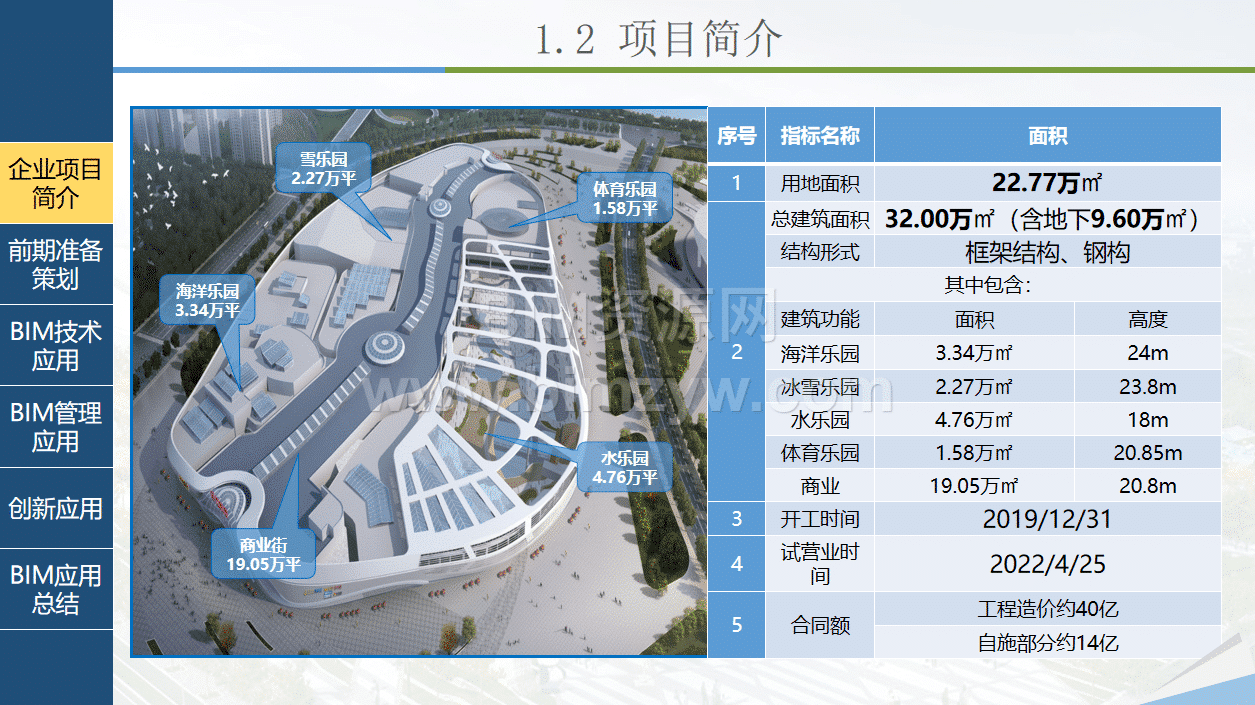 万达城万达茂项目位于兰州市七里河区崔家大滩,总用地面积22.77万㎡,总建筑面积达32万㎡(其中地下9.6万㎡),合同额约40亿元,是典型的大型商业BIM项目。项目自2019年12月开工至2022年4月试营业,包含地下一层商业街与车库、地上四层的四大乐园及商业区,以及室外水乐园区域。由于建筑外形曲面复杂、业态功能多样、结构整合难度大,项目面临诸多施工与设计挑战,其中冰雪乐园滑道、高支模体系与水乐园机房施工均为BIM技术重点攻克难题。