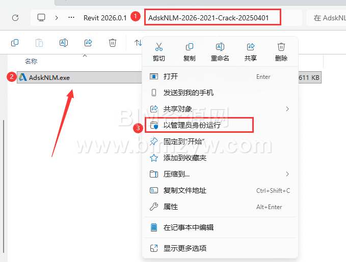 8、激活前请保持Revit2026软件处于关闭状态,然后在安装包中找到位于AdskNLM-2026-2021-Crack-20250401文件夹下的AdskNLM.exe文件,然后鼠标右键单击,选择以管理员身份运行