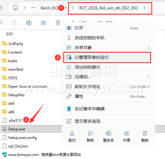 2、双击进入解压后的文件夹,从RVT_2026_NA_win_db_002_002文件夹中找到setup.exe,鼠标右键单击,选择以管理员身份运行