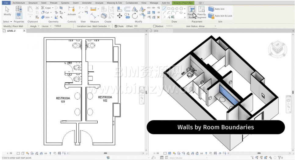 Revit 2026 提供了两种新的墙体生成方式:“按房间”(一个房间边界生成墙)和“按段落”(选择一个线段生成墙)工具,对室内快速布局、翻新项目具备较大帮助。