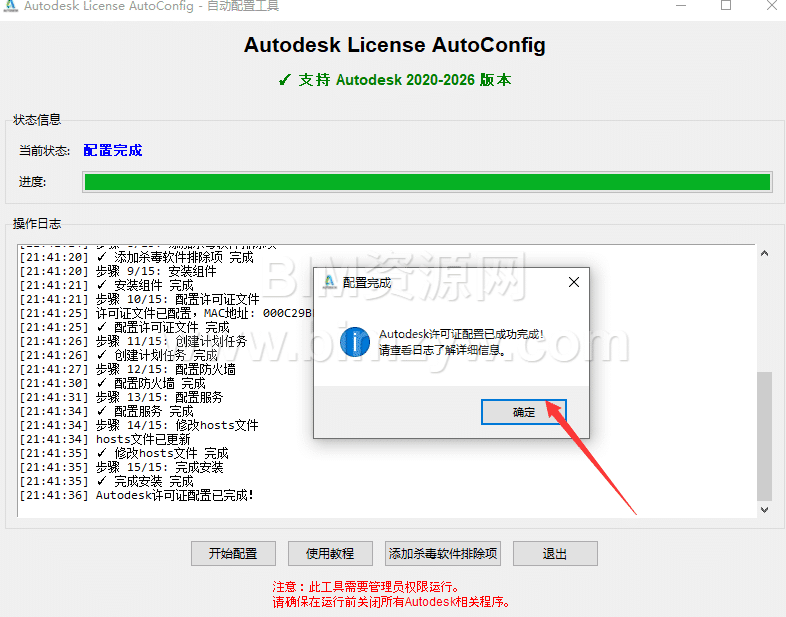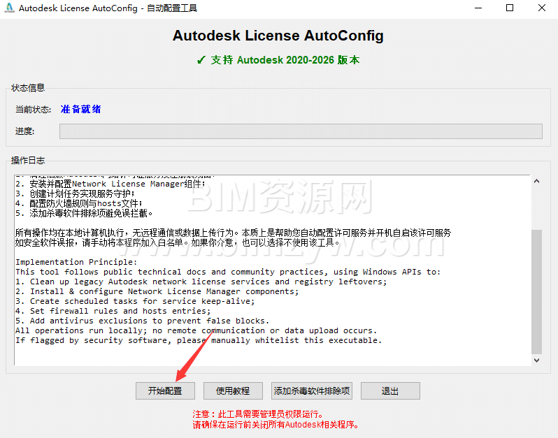 使用特别开发版本的Autodesk License AutoConfig可以解决99%以上概率Revit2022激活后出现的网络许可不可用问题,该工具使用简单,一键即可配置许可,无需繁琐操作,使用方法如下:
