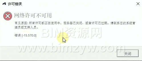 Autodesk 许可错误(错误代码 [-15.570.0])界面明确显示 “网络许可不可用”,并标注常见原因:“所有许可都正在使用中、服务器已关闭,或者许可已过期。请联系您的系统管理员或支持人员”,底部提供 “关闭” 按钮。