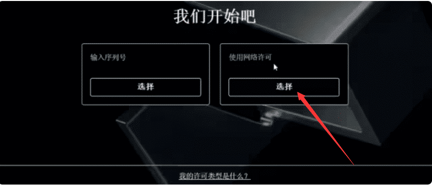 - 软件启动后会弹出 “我们开始吧” 界面,提供 “使用您的 Autodesk ID 登录”“输入序列号”“使用网络许可” 三个选项,点击 “使用网络许可”。