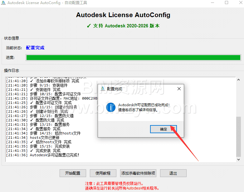 当操作日志显示 “[21:41:36] Autodesk 许可证配置已完成!”,且弹出 “Autodesk 许可证配置已成功完成!请查看日志了解详细信息” 的弹窗时,点击 “确定” 即可关闭工具。