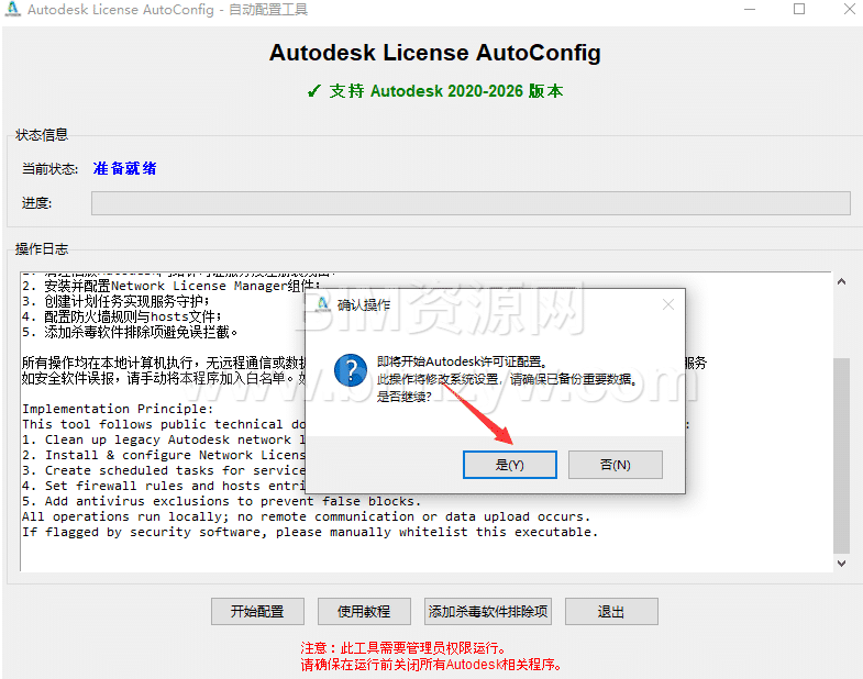 点击 “开始配置” 后,会弹出确认窗口,提示 “即将开始 Autodesk 许可证配置。此操作将修改系统设置,请确保已备份重要数据。是否继续?”。请仔细核对是否已关闭所有 Autodesk 相关程序(如 Revit、AutoCAD 等),确认无误后点击 “是 (Y)” 继续。