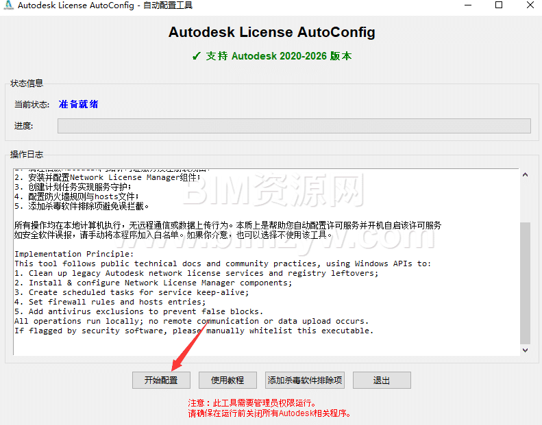 打开工具后,界面会显示 “Autodesk License AutoConfig – 自动配置工具” 标题,且标注 “√支持 Autodesk 2020-2026 版本”。此时 “当前状态” 为 “准备就绪”,点击界面中的 “开始配置” 按钮即可启动流程。
