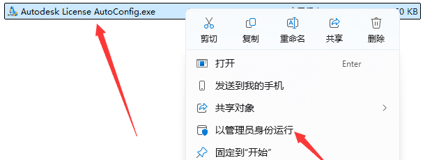 - 找到下载后的 “Autodesk License AutoConfig.exe” 文件,鼠标右键单击,在弹出的菜单中选择 “以管理员身份运行”(需确保当前账户拥有管理员权限)。