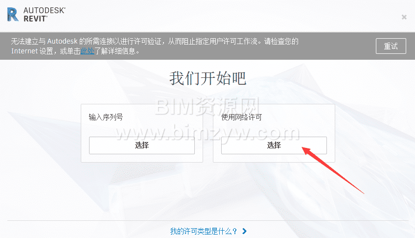 - 在 “我们开始吧” 界面选择 “使用网络许可”。