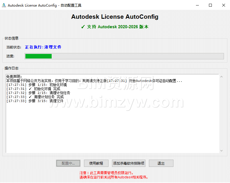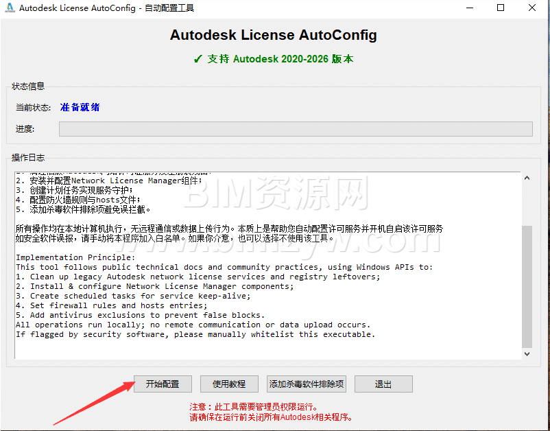 打开工具,确认界面显示 “支持 Autodesk 2020-2026 版本”,点击 “开始配置”。工具将自动清理旧许可残留、安装 NLM 组件、配置防火墙与 hosts 文件等。