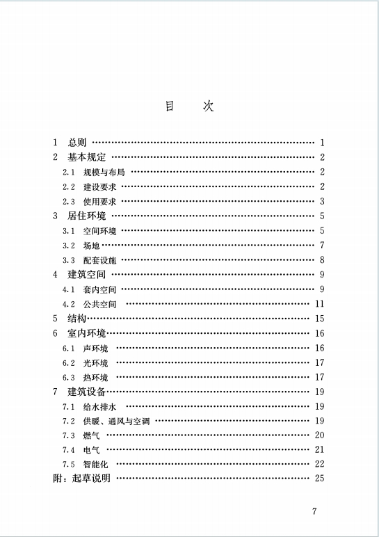 - 核心内容涵盖总则、基本规定、居住环境、建筑空间、结构、室内环境、建筑设备七大模块,明确住宅项目的规模、布局、功能、性能及关键技术要求。