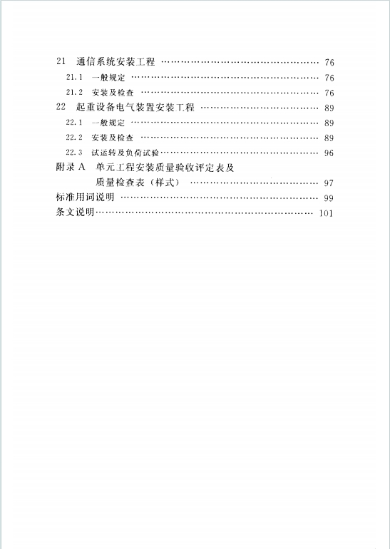 - 标准共 22 章 + 1 个附录,涵盖总则、术语、基本规定及各类发电电气设备安装工程的验收评定要求,核心是统一单元工程划分、检验标准、验收程序及质量等级评定规则。