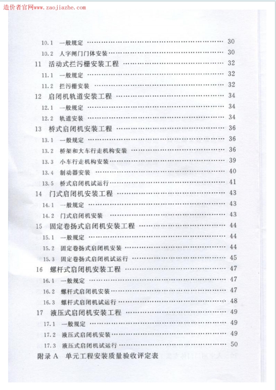 - 启闭机类:涵盖桥式、门式、固定卷扬式、螺杆式、液压式启闭机,明确轨道安装偏差、制动器性能及试运行(无载荷、静载、动载)要求。
