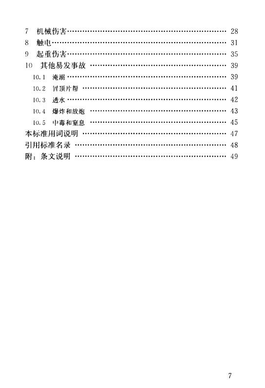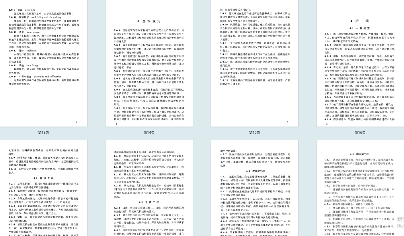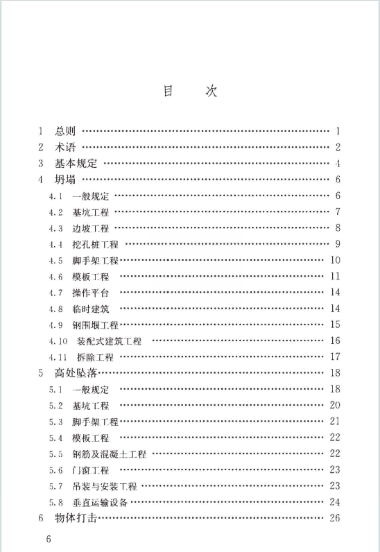 标准共 10 章,围绕建筑施工易发事故防治展开。正文涵盖总则(明确制定目的、适用范围)、术语(界定施工危险源、坍塌、高处坠落等核心概念)、基本规定(提出安全生产管理、危险源辨识、专项方案编制等通用要求),以及坍塌、高处坠落、物体打击、机械伤害、触电、起重伤害六大主要易发事故的具体防治要求,同时包含淹溺、冒顶片帮、透水等其他易发事故的防治规范。