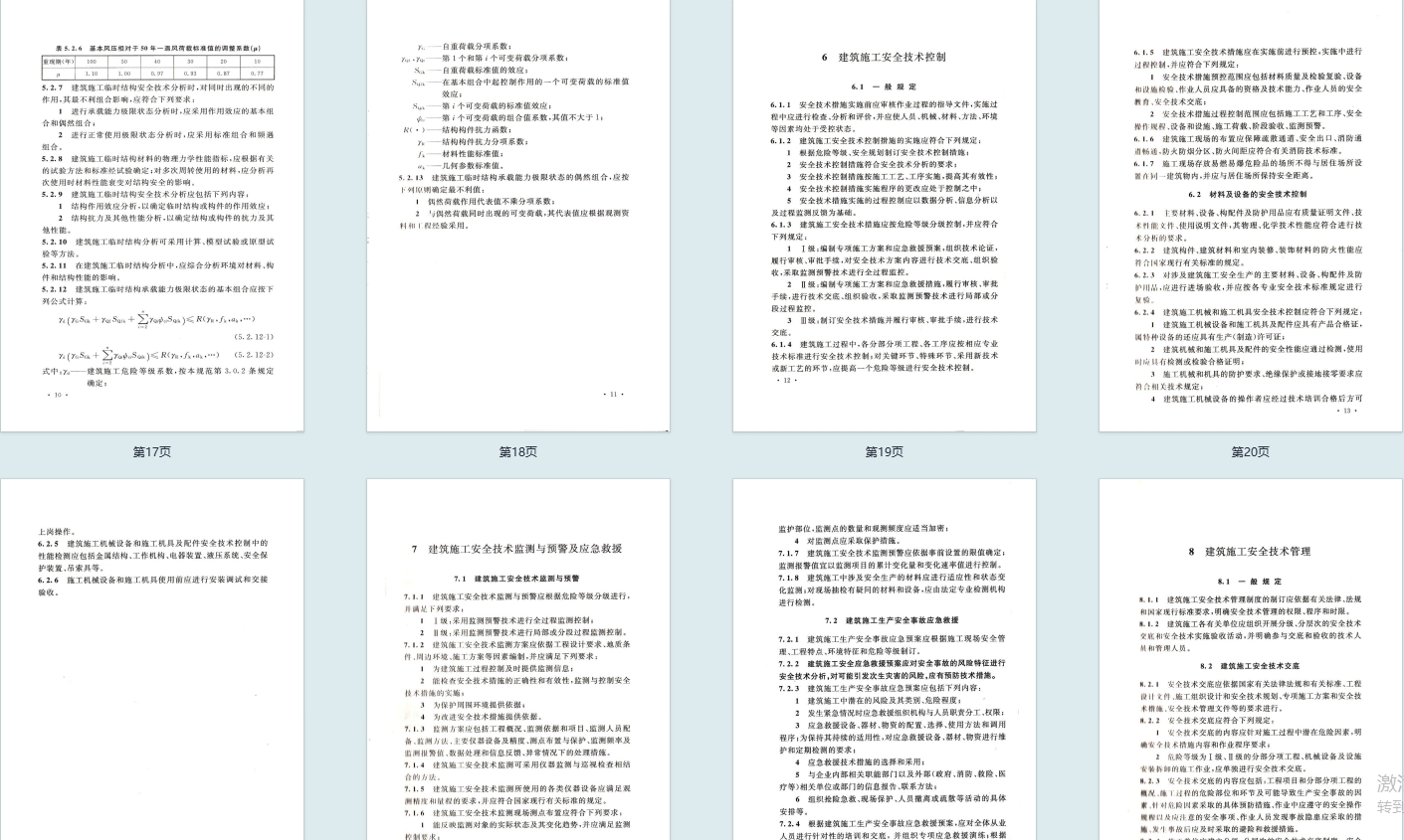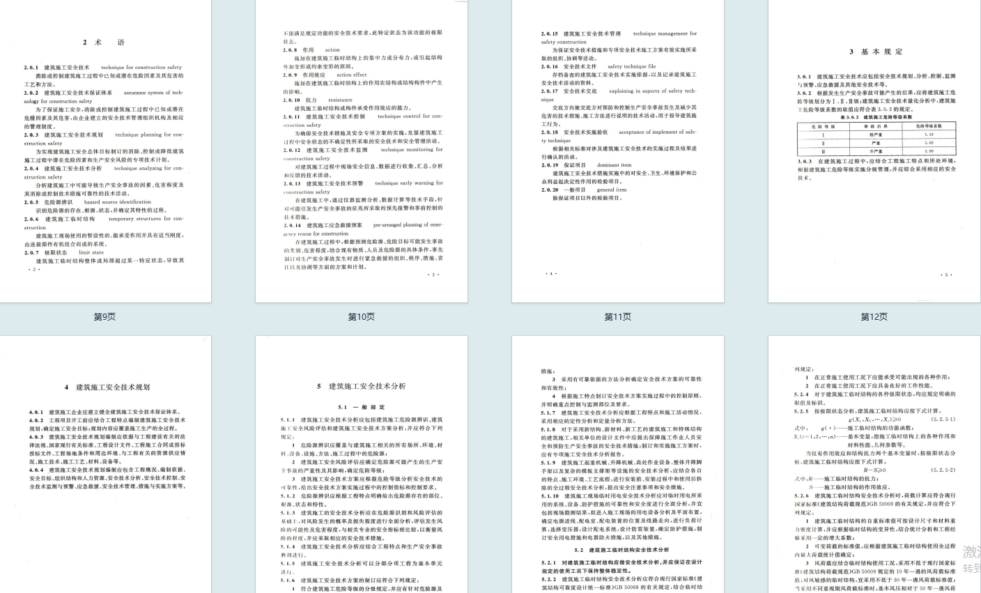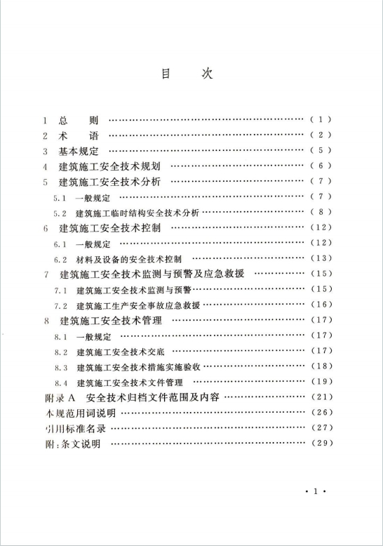 核心结构与内容:标准共 8 章、1 个附录,围绕建筑施工安全技术统一管理全流程展开。正文涵盖总则(明确制定目的、适用范围)、术语(界定建筑施工安全技术、危险源辨识等核心概念)、基本规定(划分危险等级及系数)、建筑施工安全技术规划、安全技术分析、安全技术控制、安全技术监测与预警及应急救援、安全技术管理;附录明确安全技术归档文件的范围及内容。