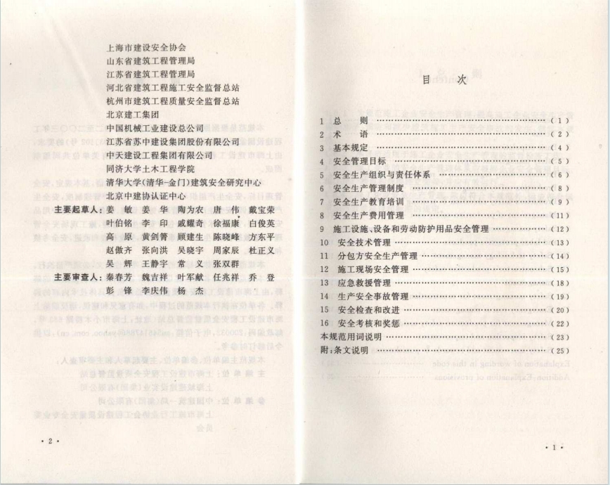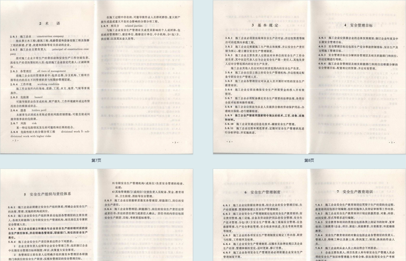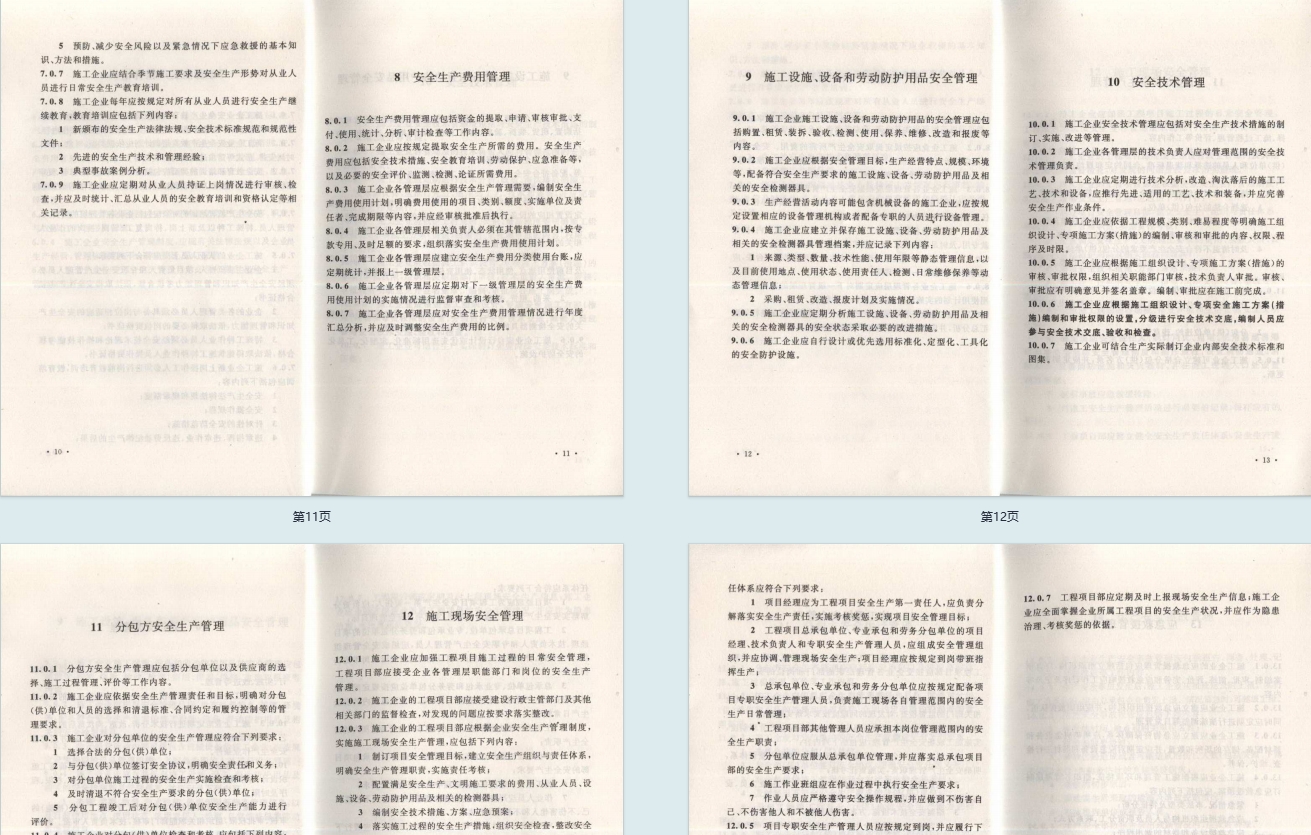 标准共 16 章,围绕施工企业安全生产全流程管理展开。正文涵盖总则(明确制定目的、适用范围)、术语(界定施工企业、危险源、隐患等核心概念)、基本规定,以及安全管理目标、安全生产组织与责任体系、安全生产管理制度、安全生产教育培训、安全生产费用管理、施工设施设备及劳动防护用品管理、安全技术管理、分包方安全生产管理、施工现场安全管理、应急救援管理、生产安全事故管理、安全检查和改进、安全考核和奖惩等内容。