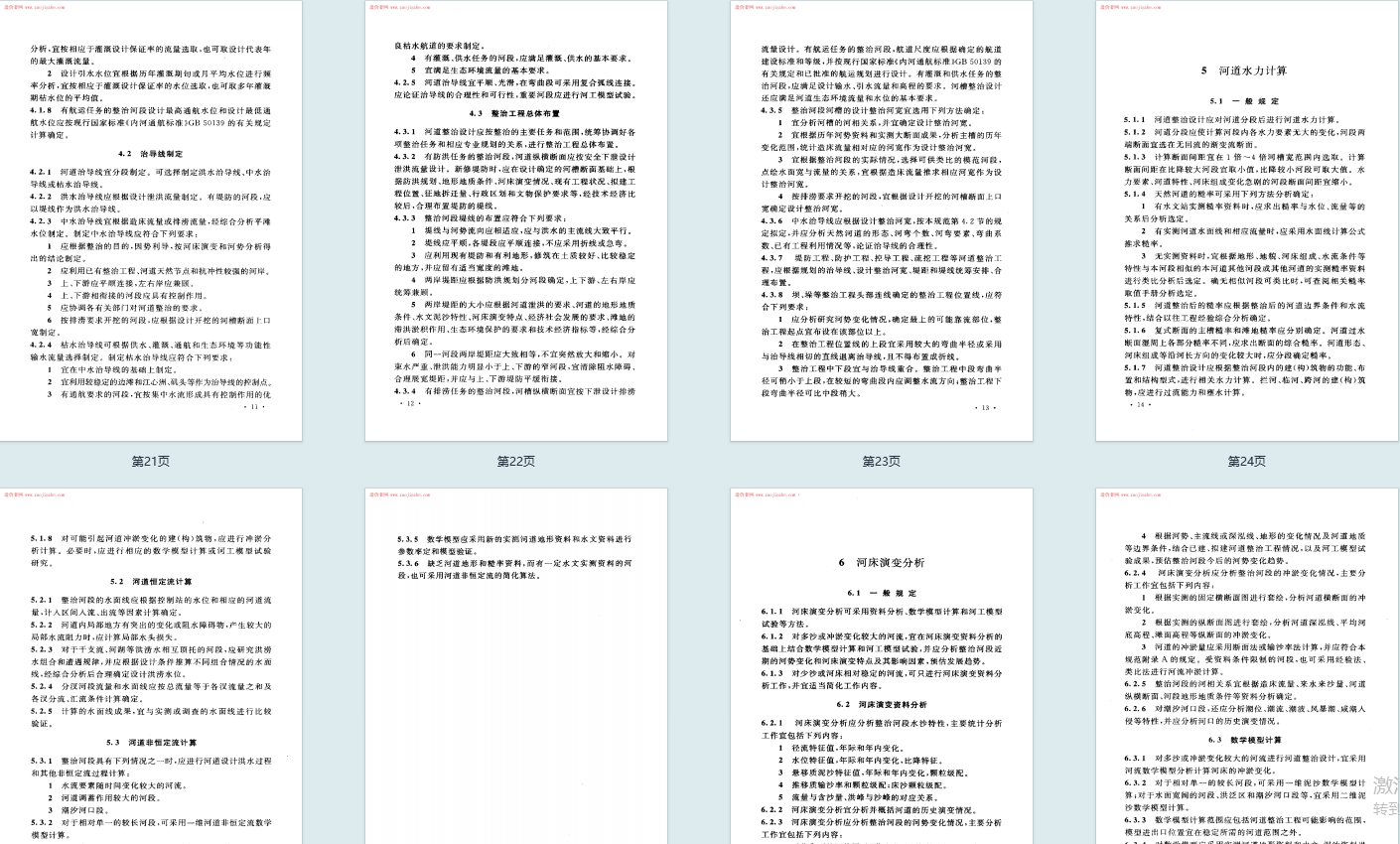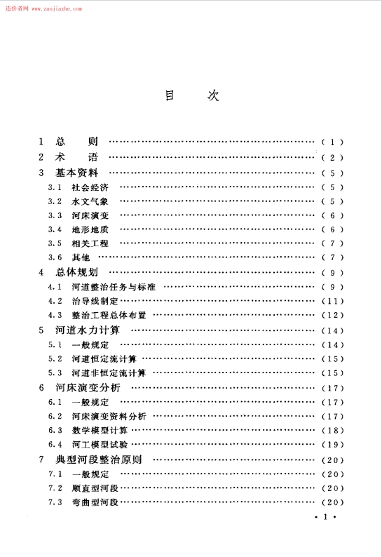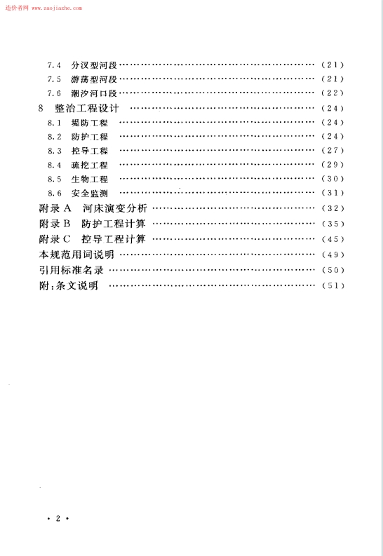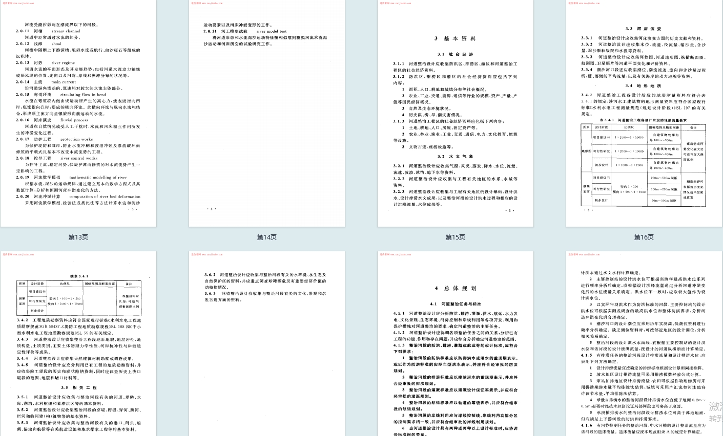 核心结构与内容:标准共 8 章、3 个附录,围绕河道整治设计全流程展开。正文涵盖总则(明确制定目的、适用范围)、术语(界定河道整治、治导线等核心概念)、基本资料(含社会经济、水文气象等基础资料要求)、总体规划、河道水力计算、河床演变分析、典型河段整治原则、整治工程设计;附录包含河床演变分析、防护工程计算、控导工程计算的具体方法与公式。