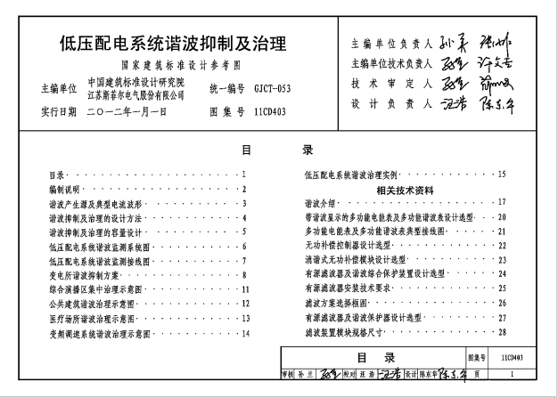 2012 年 1 月 1 日实行的国家建筑标准设计参考图集(图集号 11CD403),聚焦低压配电系统谐波抑制及治理,为相关工程设计与改造提供规范参考。