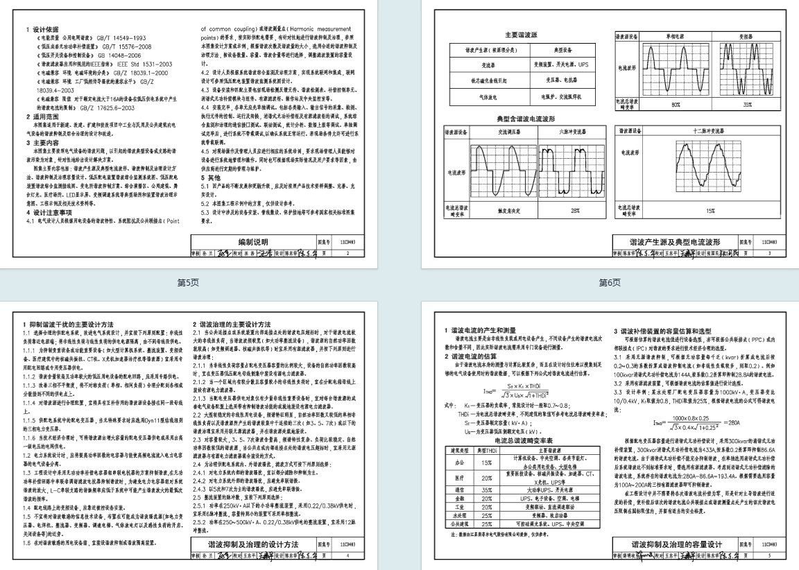 - 核心要点:明确谐波产生源(变流器、铁芯磁化设备等)及危害(损耗设备、干扰控制等);提供谐波抑制(合理设计供配电系统、隔离非线性负荷等)与治理(有源滤波器、无源滤波器等)设计方法,含容量计算方式;给出监测系统图、接线图及变电所、医疗场所等典型场景治理方案。