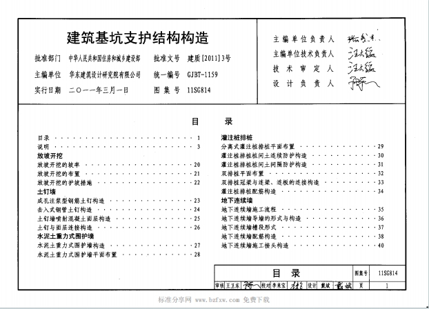 2011 年 3 月 1 日实行的国家建筑标准设计图集(图集号 11SG814),聚焦建筑基坑支护结构构造,为一般地质条件下的基坑支护设计、施工提供全面规范参考,市政、铁路等工程的陆上及临水基坑可参照使用。