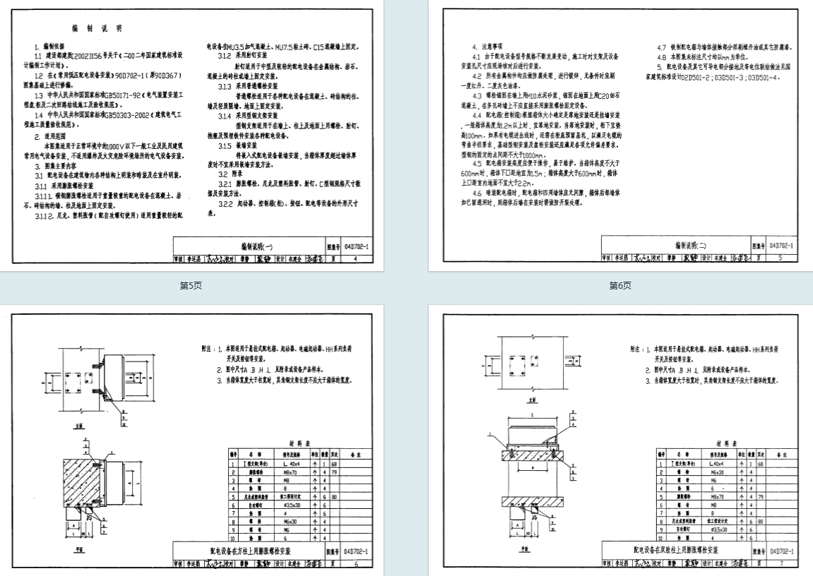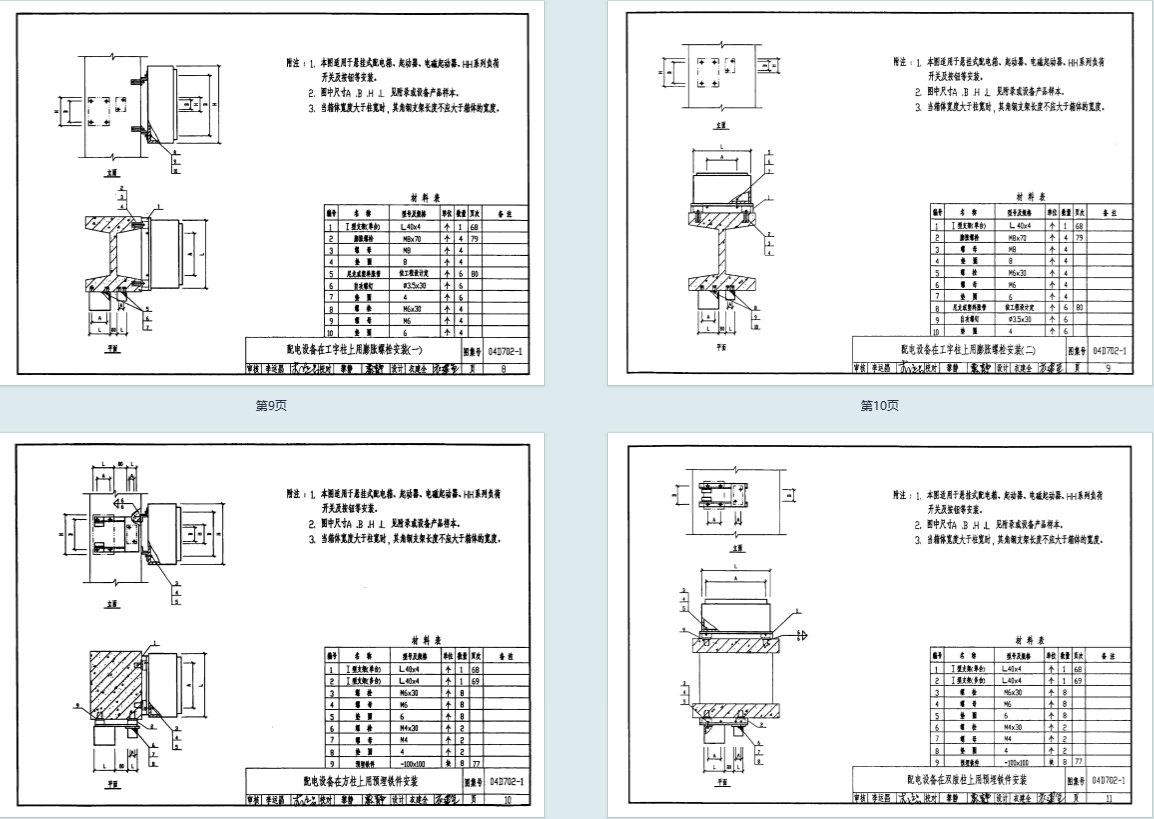 - 核心内容:涵盖配电设备在柱、墙、钢结构、楼板等不同结构上的明装、暗装、落地安装等多种方式;明确膨胀螺栓、射钉、型钢支架等固定件的选用与施工要求;附带各类配电设备外形尺寸表及安装零件图。