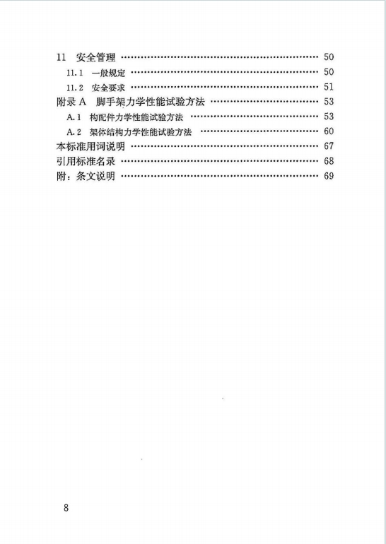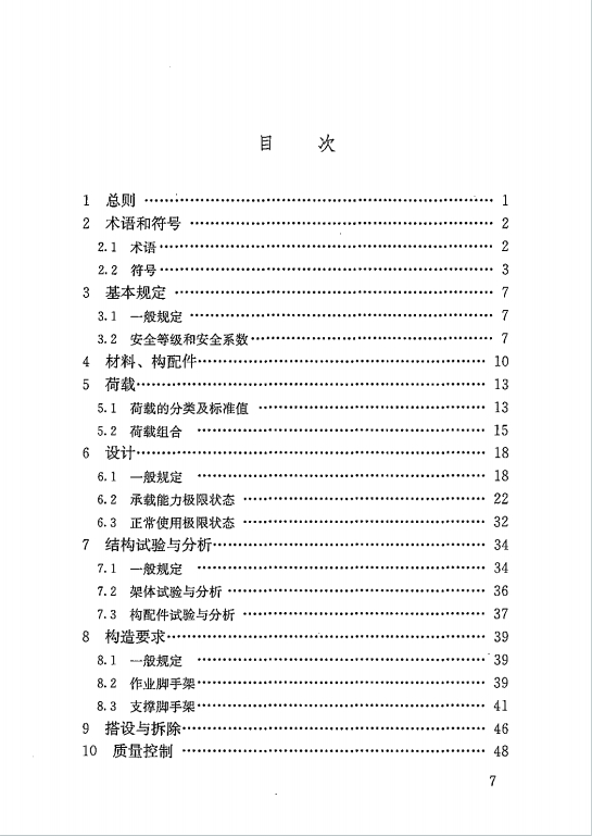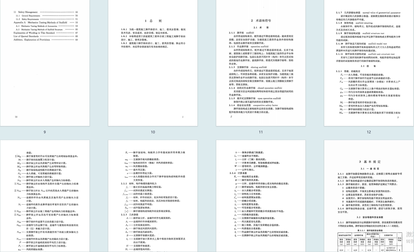 - 基础框架:包含总则、术语和符号、基本规定、材料构配件、荷载、设计、结构试验与分析、构造要求、搭设与拆除、质量控制、安全管理 11 大核心章节,覆盖脚手架全生命周期管理。