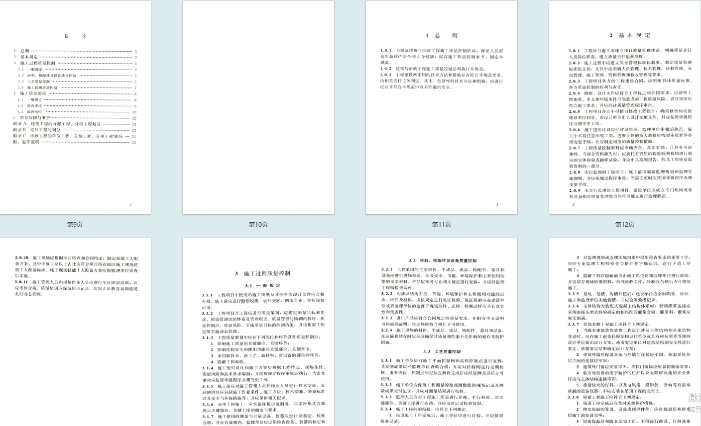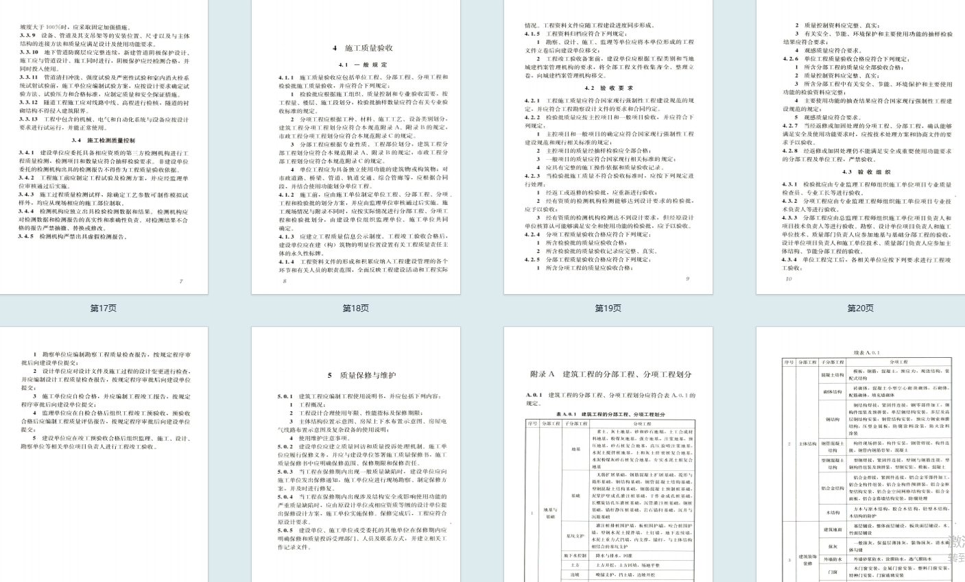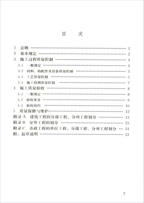 - 基础框架:包含总则、基本规定、施工过程质量控制、施工质量验收、质量保修与维护 5 大章节,配套 3 个附录(建筑、室外、市政工程的分部 / 分项工程划分)。