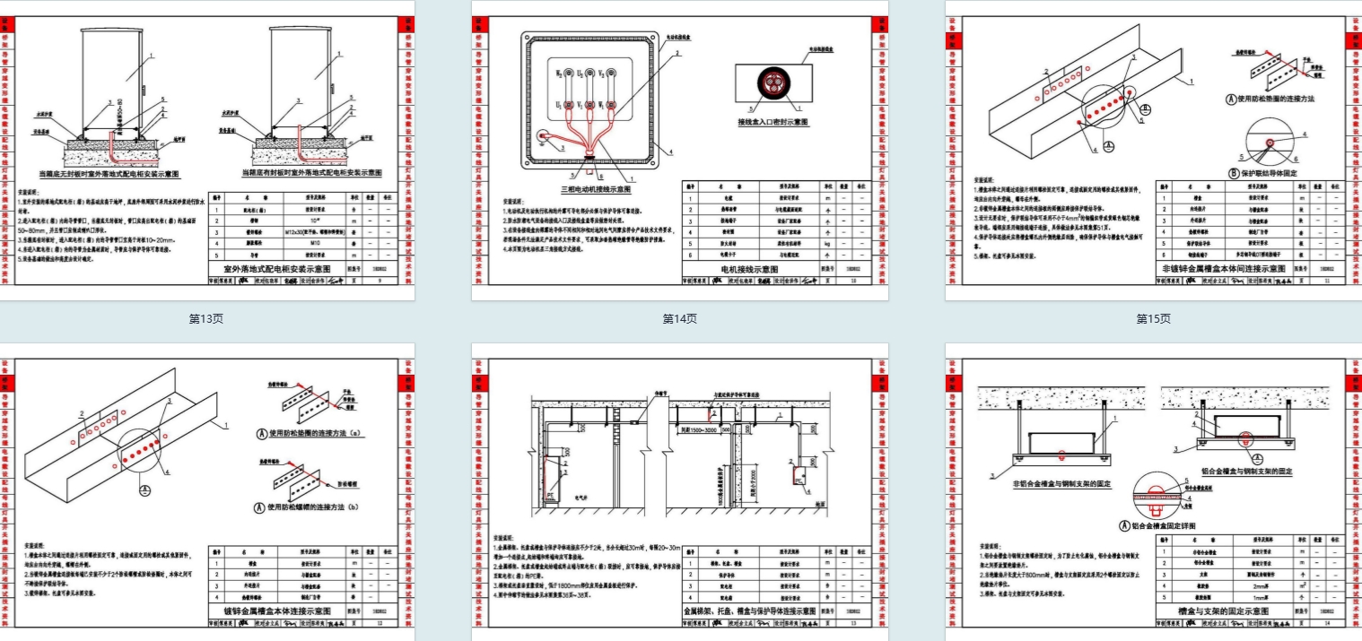 - 关键特点:注重实操性,提供各类节点详图(如导管连接、防火封堵、接地连接等),明确不同场景下的施工规范,同时包含导线连接器、矿物绝缘电缆等相关技术资料,适配工程实际需求。