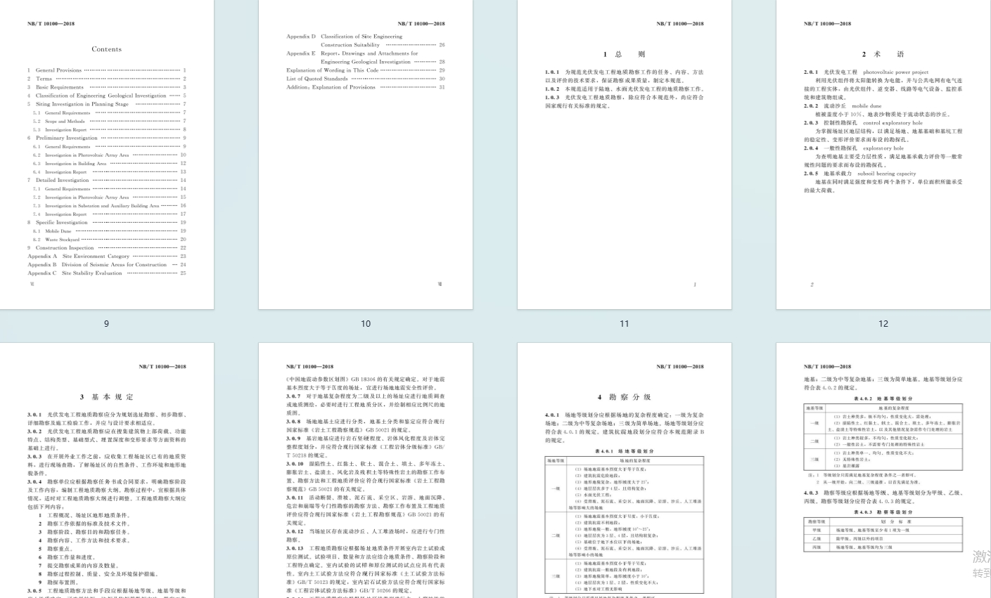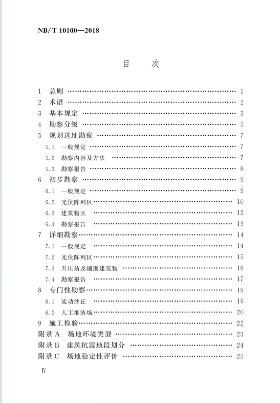 2018 年发布、2019 年 5 月 1 日实施的能源行业标准《光伏发电工程地质勘察规范》(NB/T 10100-2018),核心是规范陆地及水面光伏发电工程的地质勘察工作,明确勘察分级、阶段任务、方法及评价要求,为工程选址、设计和施工提供地质依据。