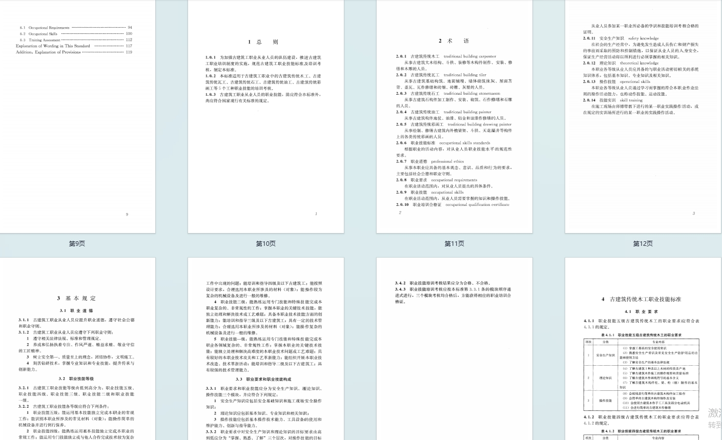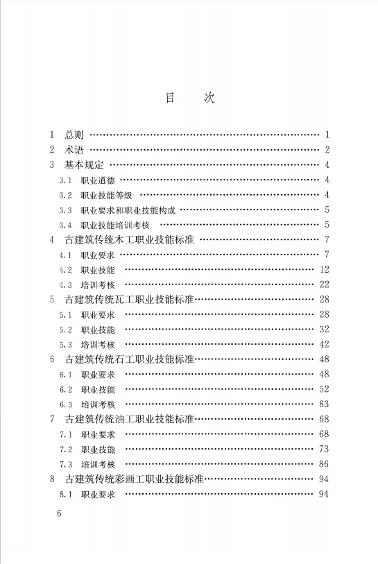 JGJ/T 463-2019 是 2019 年 10 月 1 日实施的行业标准,针对古建筑工职业的 5 个核心工种(传统木工、瓦工、石工、油工、彩画工),建立了系统化的职业技能等级体系和培训考核要求,为古建筑行业人才培养和技能规范提供依据,其内容可分为