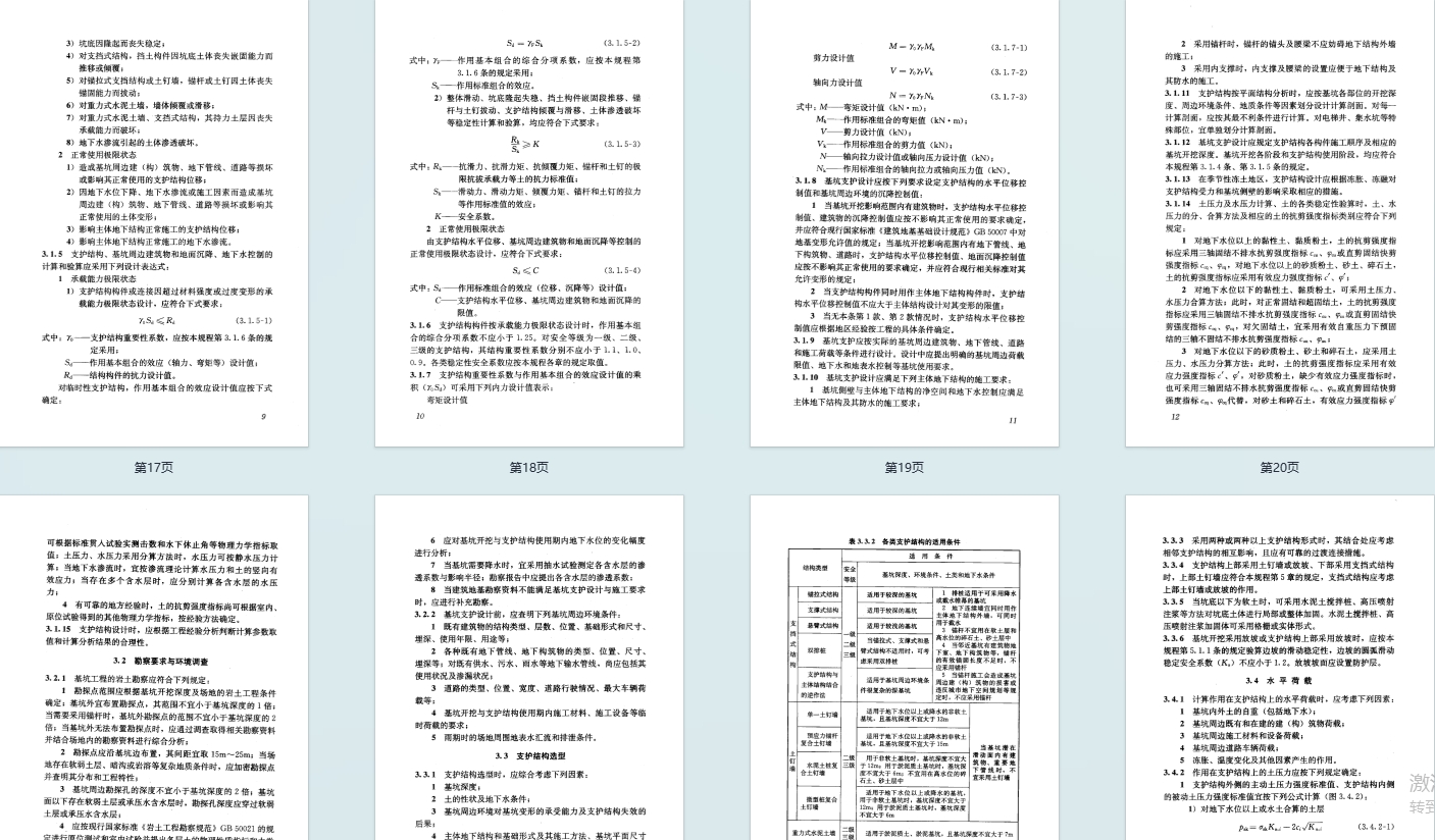 - 设计原则:基坑支护设计使用期限不少于 1 年,需满足保护周边环境和提供施工空间的功能,按破坏后果划分为一级、二级、三级安全等级,需进行承载能力和正常使用两类极限状态验算,明确了荷载组合、结构重要性系数及变形控制值的确定原则。