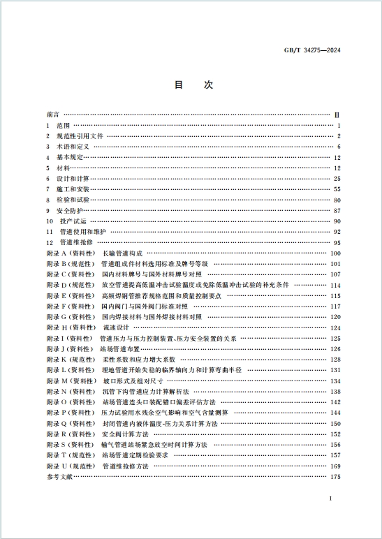 GB/T34275-2024 替代 GB/T34275-2017,是陆上油气长输管道全生命周期的技术规范,覆盖材料、设计、施工、检验、安全防护、试运投产、使用维护及维抢修等全流程,核心内容如下: