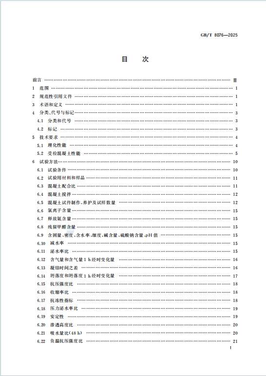GB/T 8076-2025 于 2025 年 10 月 31 日发布、2026 年 8 月 1 日实施,替代 GB 8076-2008,是混凝土外加剂生产与检验的国家标准,其核心内容如下: