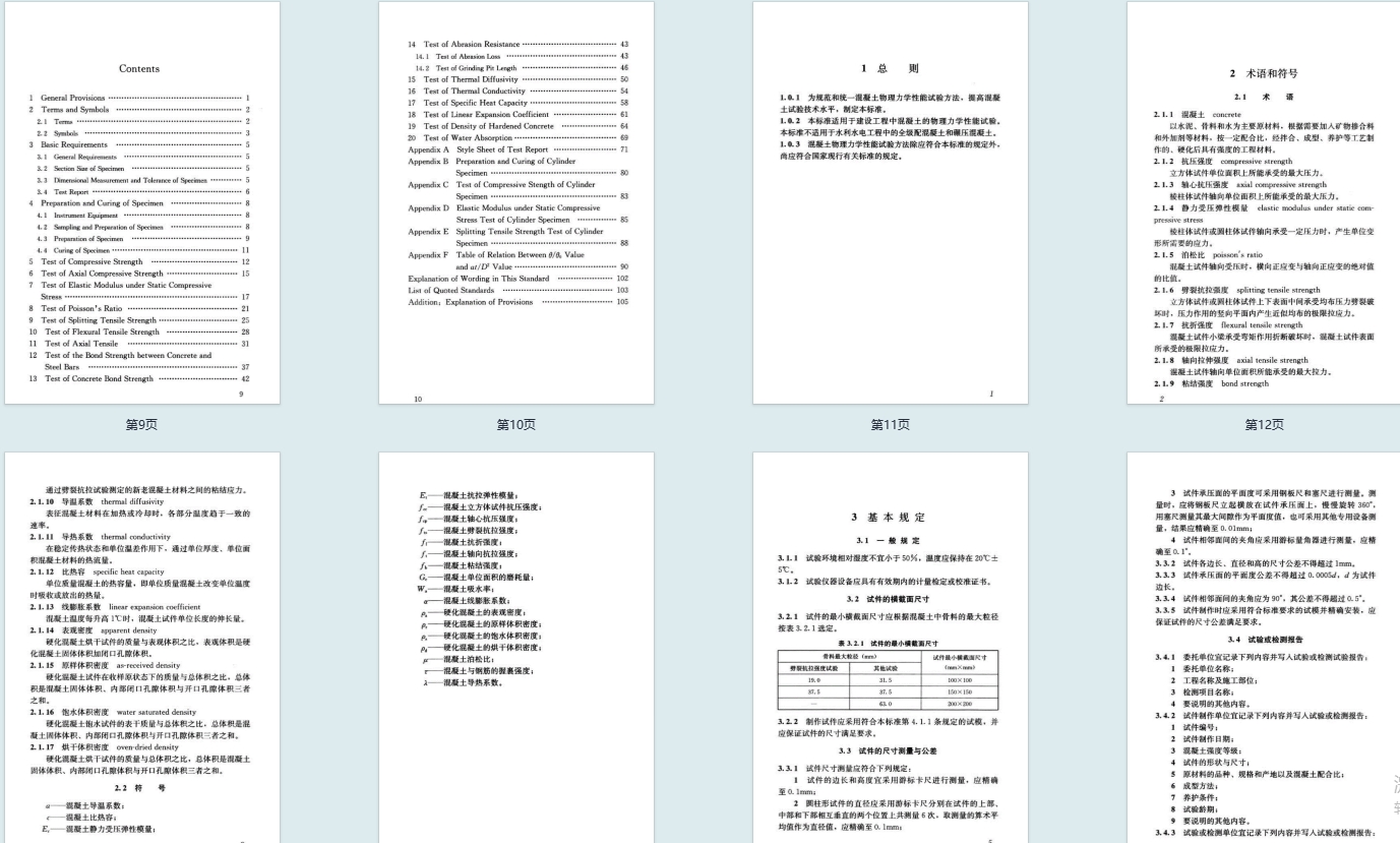 - 新增泊松比、轴向拉伸、混凝土与钢筋握裹强度、粘结强度、耐磨性、导温系数、导热系数、比热容、线膨胀系数、硬化混凝土密度、吸水率等多项试验方法,还补充了相关附录表格。