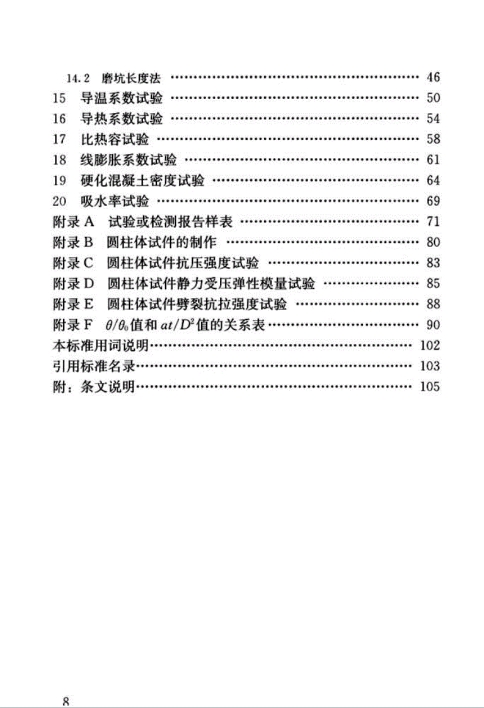 - 物理性能:包含耐磨性(磨耗量法、磨坑长度法)、导温系数、导热系数、比热容、线膨胀系数、硬化混凝土密度(表观 / 原样 / 饱水 / 烘干)、吸水率等试验,规定了各试验的操作流程与数据处理方式。
