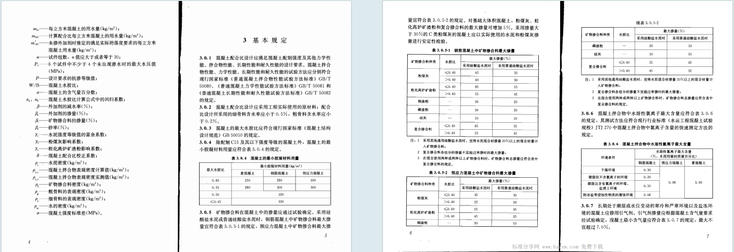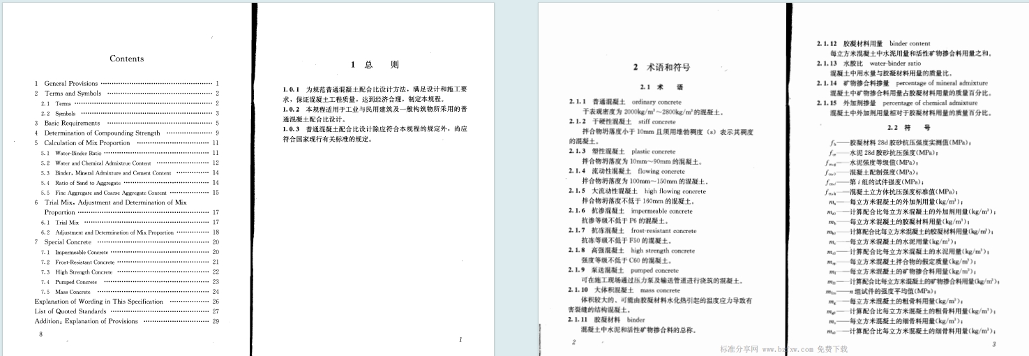 - 胶凝材料用量:由水胶比与用水量计算,再根据矿物掺合料掺量确定水泥与掺合料用量,且需满足最小胶凝材料用量要求。