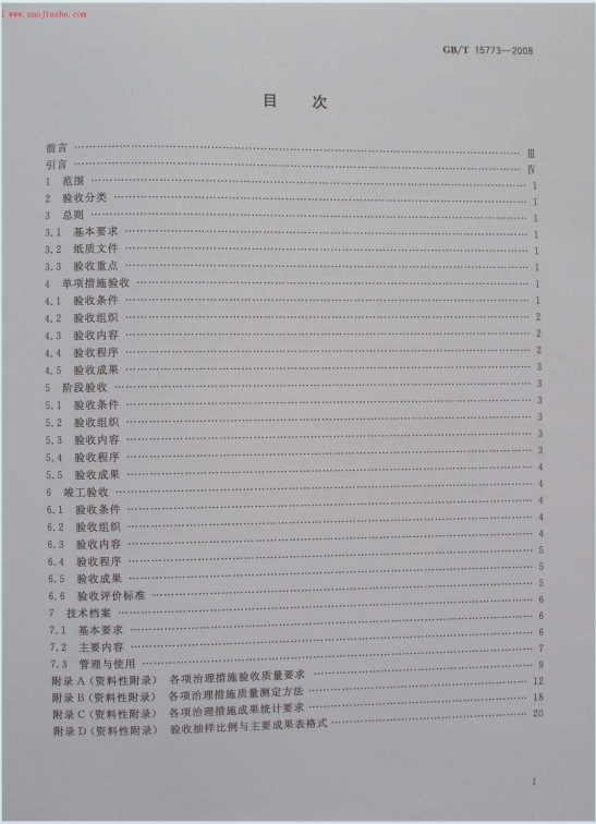 GB/T 15773-2008 于 2008 年 11 月发布、2009 年 2 月实施,替代 GB/T 15773-1995,共 7 章及 4 个资料性附录,是水土保持综合治理验收的国家标准,适用于中央、地方、外资投资的小流域综合治理及专项工程验收,群众和社会出资项目、大中流域大面积治理区可参照执行,核心内容如下:
