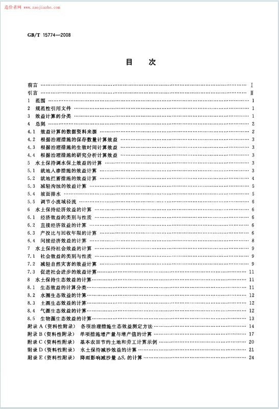 GB/T 15774-2008 于 2008 年 11 月发布、2009 年 2 月实施,替代 GB/T 15774-1995,共 8 章及 5 个资料性附录,是水土保持综合治理效益计算的国家标准,适用于水蚀及水蚀风蚀交错区小流域及大中流域、各级行政区的水土保持效益计算,核心内容如下: