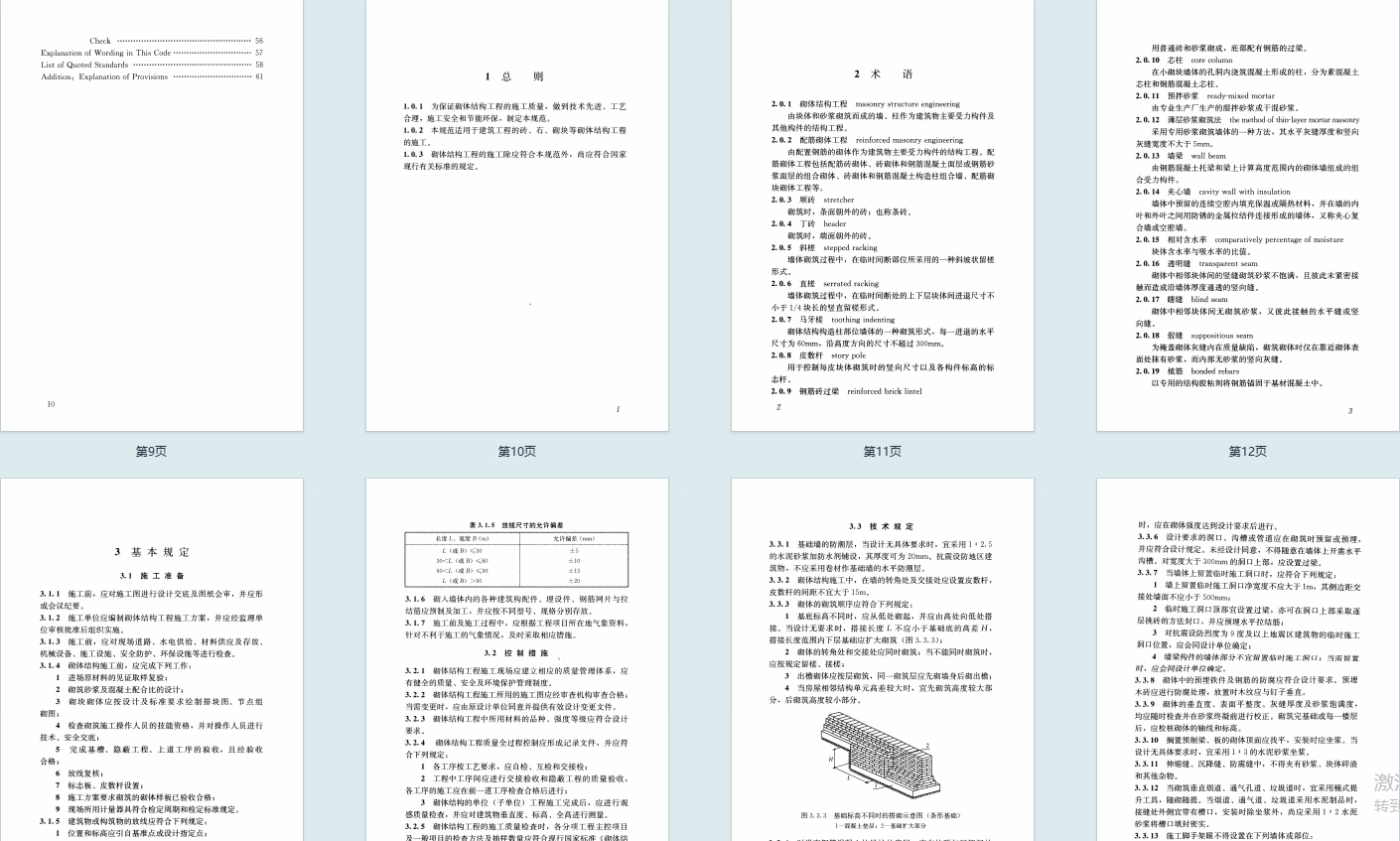 国家标准,2014 年 1 月 29 日发布、10 月 1 日实施,其中第 4.2.2、6.2.4、8.3.5 条为强制性条文,由陕西省建筑科学研究院等单位主编,共 12 章及 3 个附录,是砌体结构工程施工的通用技术规范,核心内容如下: