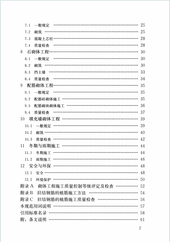 - 适用于建筑工程中砖、石、砌块等砌体结构工程的施工,要求施工过程保证质量、技术先进、工艺合理,兼顾施工安全与节能环保,同时需符合国家现行其他相关标准。