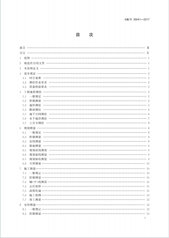 GB/T 35641-2017 是我国规范工程测绘工作的国家标准,2017 年 12 月 29 日发布、2018 年 7 月 1 日实施,适用于工程测绘的技术设计与作业实施,旨在为工程建设全阶段测绘工作提供统一技术依据。