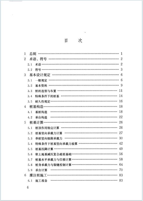 - 设计规定:明确桩基按承载能力和正常使用两类极限状态设计,划分甲、乙、丙三个设计等级,需综合考虑地质、荷载、施工条件等进行桩型选型与布置,特殊条件(软土、湿陷性黄土、冻土等)下桩基有专项设计原则,同时规定了桩基耐久性的混凝土指标与裂缝控制要求。