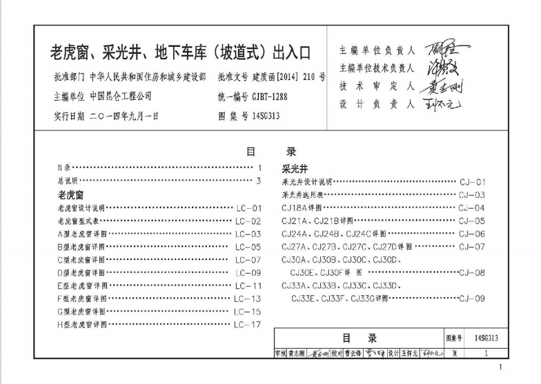 14SG313《老虎窗、采光井、地下车库 (坡道式) 出入口》是 2014 年 9 月 1 日实施的国家建筑标准设计图集,为相关建筑构件提供结构设计、配筋及构造详图依据。