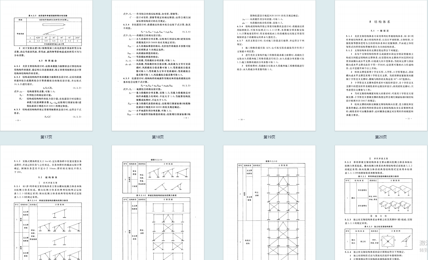 - 结构与构件:规定支架结构体系(单列 / 双列单坡、独立柱等),构件(柱、梁、檩条、支撑)的强度、稳定及变形计算要求。