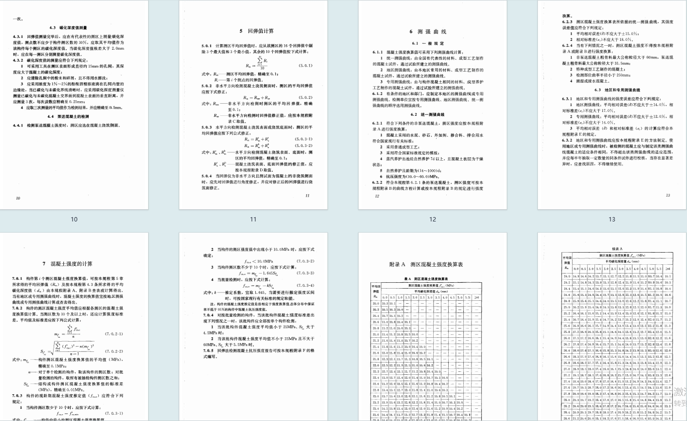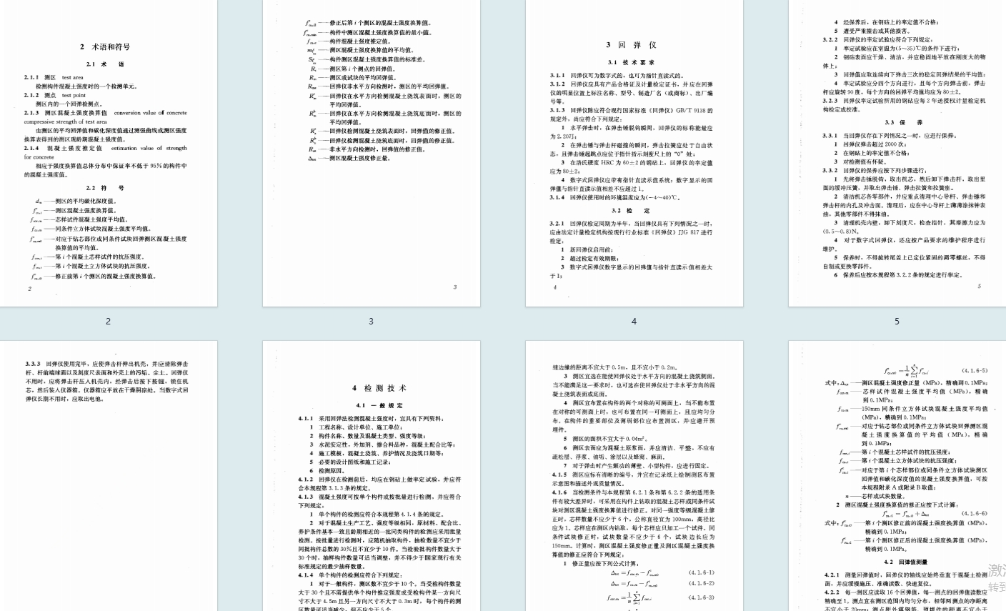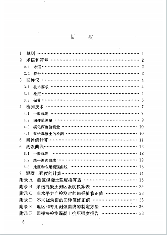 - 核心章节:包含总则、术语和符号、回弹仪、检测技术、回弹值计算、测强曲线、混凝土强度计算等关键内容,配套 6 个附录(强度换算表、修正值表等)。