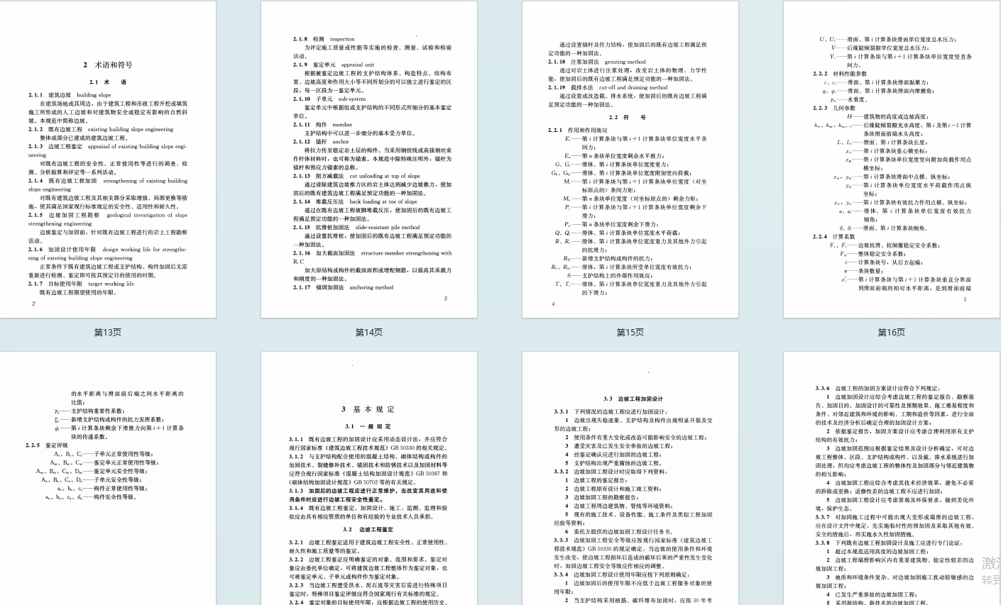- 结构体系:含 10 章 + 3 附录,涵盖总则、术语和符号、基本规定、勘察、鉴定、设计计算、加固方法、监测、施工及验收等,附录明确稳定性计算、地基基础鉴定等专项要求。