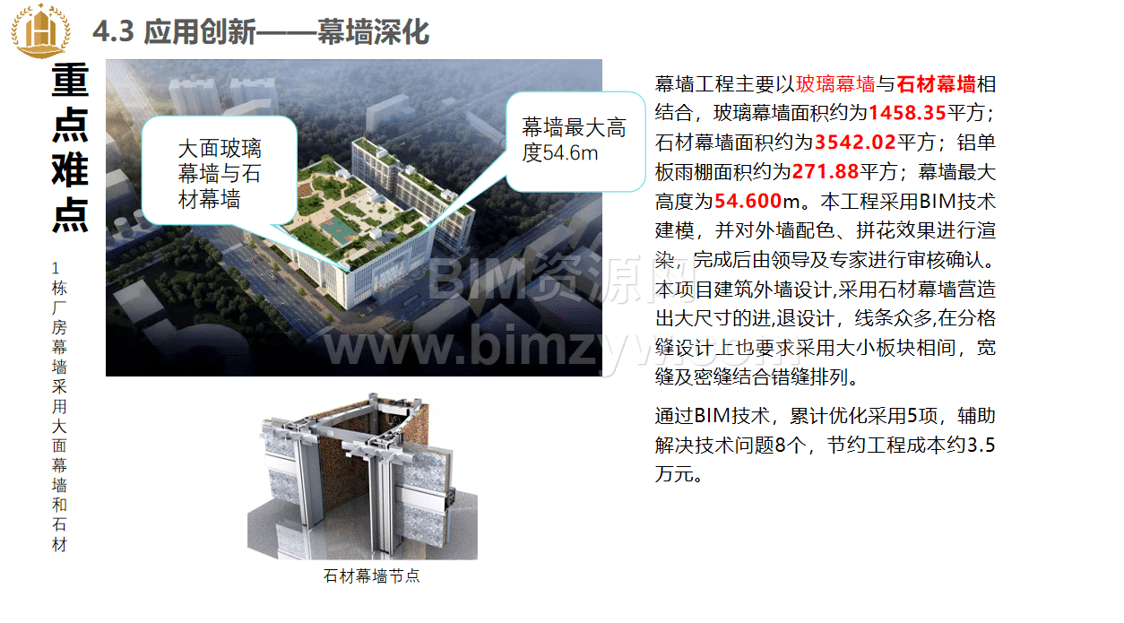 - 成本节约:通过碰撞检测减少后期返工,限额领料控制物资浪费,幕墙深化优化节约成本约 3.5 万元,整体实现降本增效目标。