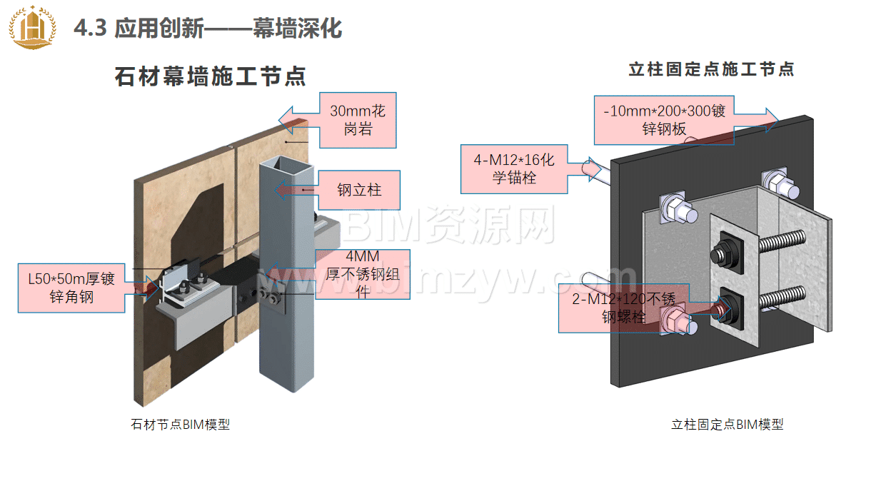- 幕墙深化设计:针对项目 1458.35㎡玻璃幕墙、3542.02㎡石材幕墙及 271.88㎡铝单板雨棚,利用 BIM 技术进行节点建模与安装工艺模拟,明确钢立柱、横梁固定方式及防火封堵要求,确保幕墙最大高度 54.6m 的安装精度,累计优化方案 5 项,节约成本约 3.5 万元。