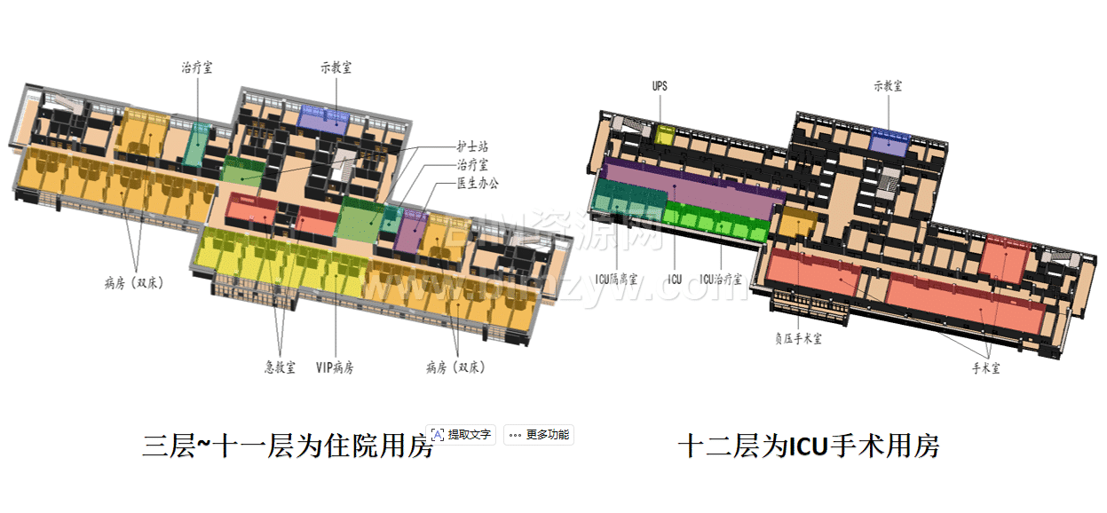 本项目总建筑面积 42581.84㎡(含半地下室 5971.66㎡),为钢筋混凝土框架 – 剪力墙结构,地下 2 层、地上 12 层,建筑高度 51.8m。项目功能分区明确,首层为医疗大堂、DSA 及药房,二层为检验科及超生科用房,三层至十一层为住院用房,十二层为 ICU 手术用房,涉及众多医疗专项,