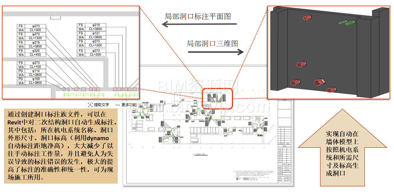 - 自动化标注:创建洞口标注族文件,在 Revit 中自动生成洞口的机电系统名称、尺寸、标高标注,减少人为失误,提升工作效率。