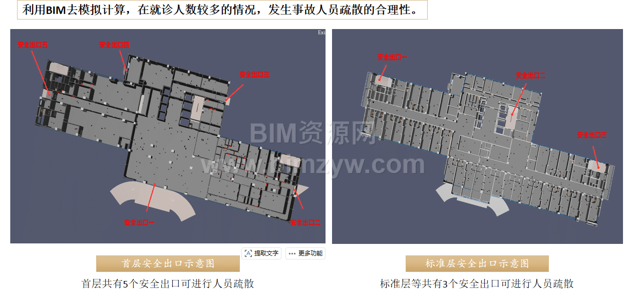 利用 BIM 技术模拟首层 211 人紧急疏散场景,基于 5 个安全出口的布局,测算逃生时间仅 18.2 秒,验证了疏散路线设计的合理性,为医疗建筑安全保障提供数字化支撑。